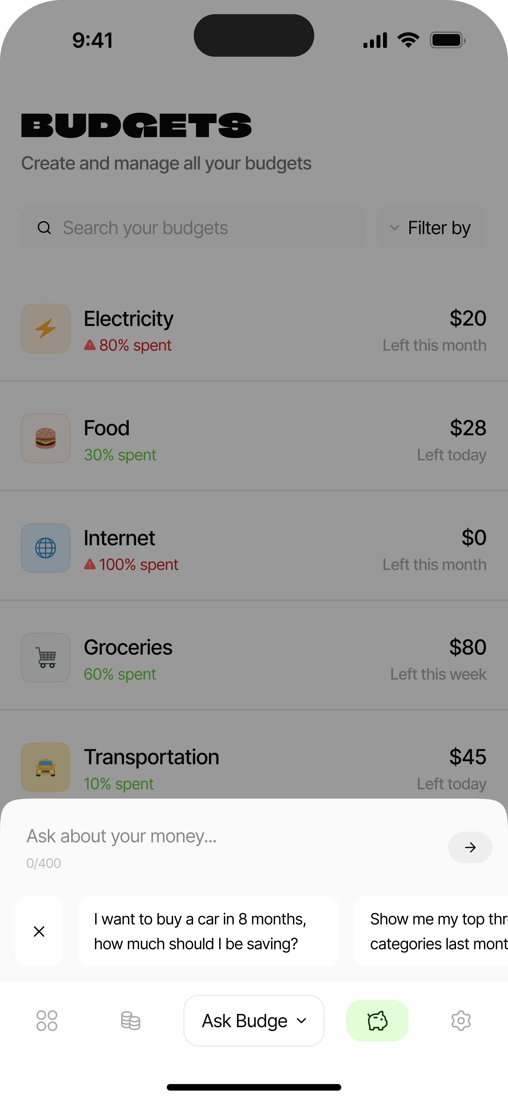 Budge AI brings together smart expense tracking, intuitive budgeting, instant syncing, and personalized AI insights to help you manage your money with ease and confidence.